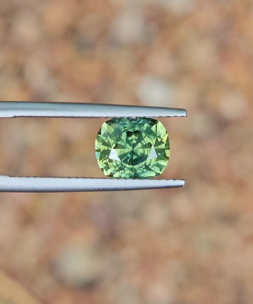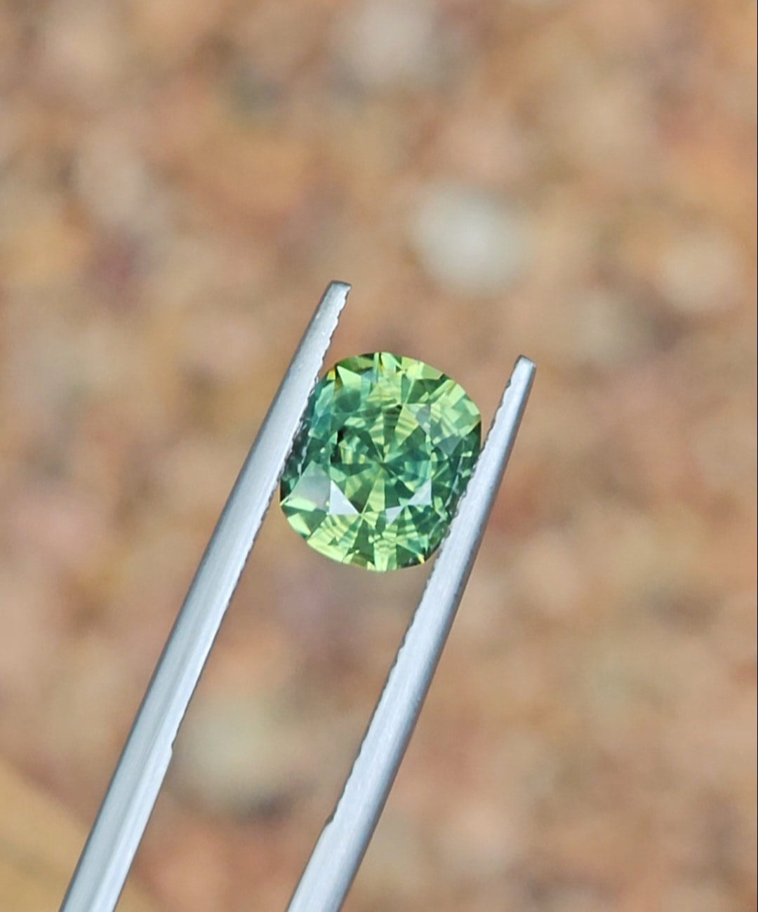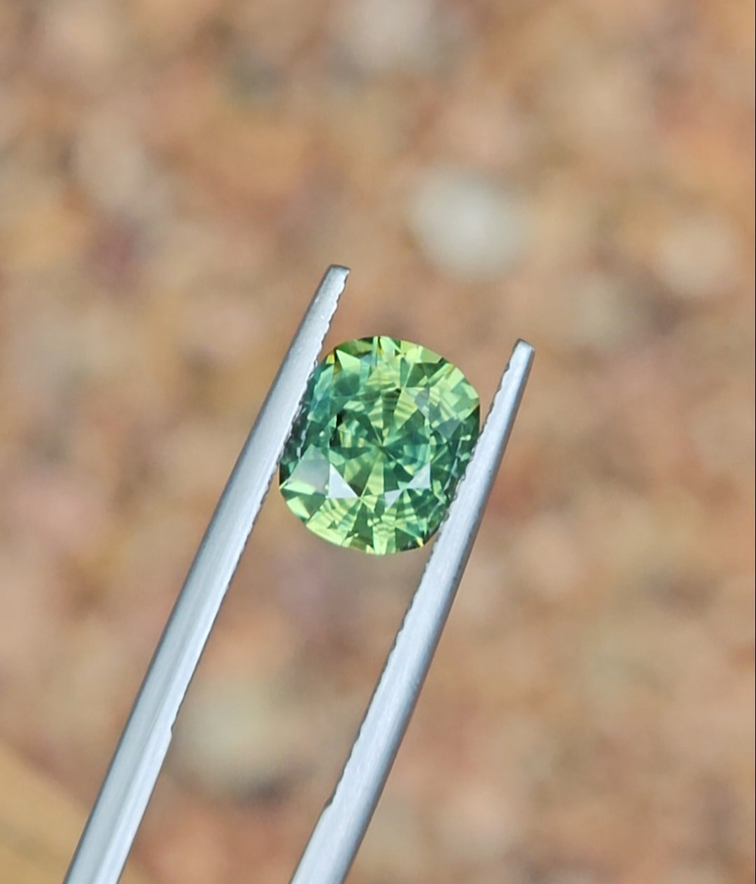 Presenting this bright green-yellow parti sapphire to you. The colours are a light and bright mix of green and yellow. As always it is faceted to an exceptional standard, by Daniel. What makes this stone unique is the colour pattern. This is a colour illusion from only 2 small colour patches and it is re appearing through the sapphire from multiple angles and facets. Often sapphires will come with these unique characteristics, making each sapphire different to the other.